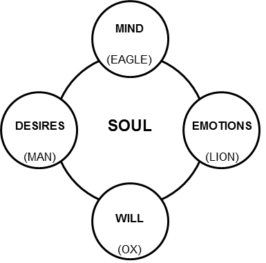 The little circle at the top represents the mind, its symbol being that of the “eagle.” The circle at the bottom represents the will, its symbol being that of an “ox.” Our circle on the right is the emotions and its symbol would be the “lion.” On the left we have the symbol of the “man” that represents the area of our desires. These dimensions, rooms, or house constitutes the entire entity that we call soul.